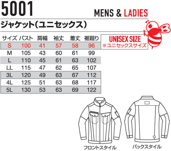 男女ユニセックスの着用にマッチするシャープなカッティングライン スペック メーカー バートル(BURTLE) 品番/シリーズ 5001 5002/5001シリーズ シーズン 秋冬物 ※このシリーズの春夏対応シリーズはコチラ 商品名 ジャケット(ユニセックス)&カーゴパンツ(ユニセックス)セット(上下同色) 素材 コーデュラストレッチデニム(伸長率27%)、製品洗い、ブラスト加工(※ブラスト加工はインディゴのみ) 混率 綿72%・ポリエステル13%・ナイロン13%・ポリウレタン2% 綿65%・ポリエステル19%・ナイロン14%・ポリウレタン2%(インディゴのみ) 仕様 ユニセックス、ストレッチ ※ジャケット:Sサイズはユニセックス対応シルエットです。