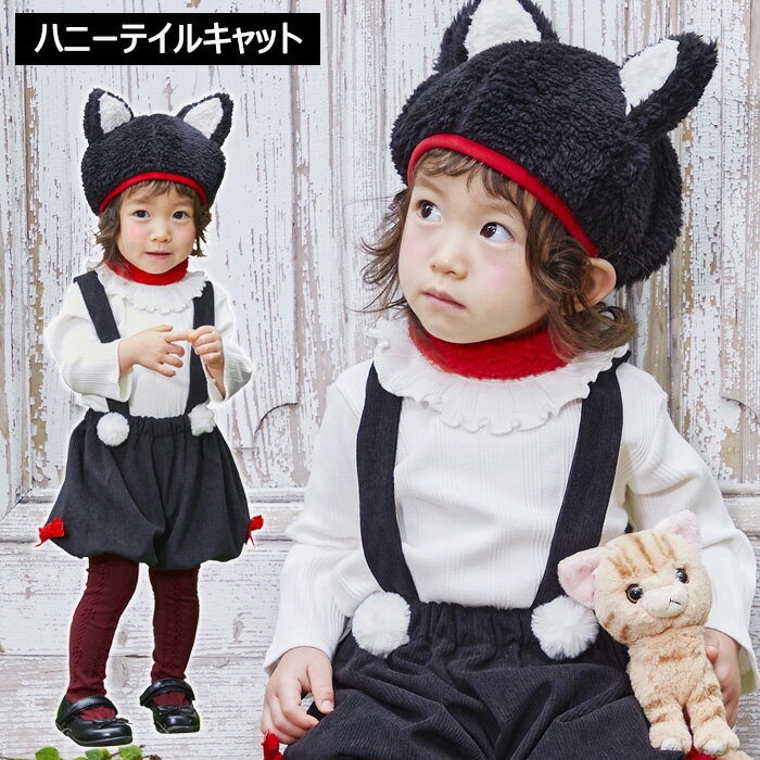 ハニーテイル キャット ベビー ブラック 黒猫 ネコ ねこ 耳 猫 被りもの もこもこ 吊り紐付き パンツ オーバーオール つりひもパンツ 紐付きパンツ 紐パンツ ベビー服 赤ちゃん 出産祝い キッズ 衣装 コスチューム ハロウィン コスプレ 2022 仮装 男の子 女の子 s-cs-9a543