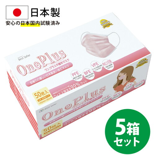 マスク 不織布 日本製 50枚 在庫あり OnePlus(ワンプラス) ピンク 小さめサイズ 女性用 子供用 3層構造 250枚セット(50枚入り×5) 99%カット高性能フィルター