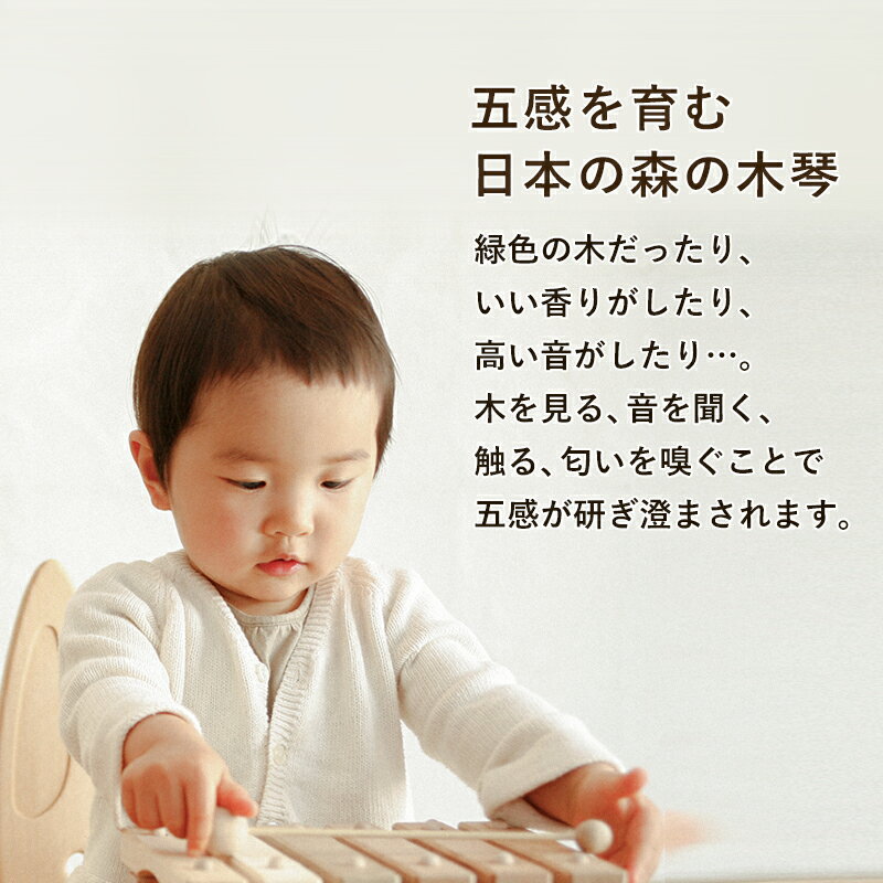 [商品情報] サイズ幅27×奥行21.3×高さ5cm 材 種(枠)国産ブナ (音盤)国産ナラ、センダン、サクラ、ホオ、トチ、ヒノキ 仕上げ無塗装 重 さ約620g 付属品バチ1本 木のガイドブック ◆使用上の注意◆ 木琴本体やバチは、遊ぶお子さまの健康を配慮して無塗装で仕上げました。