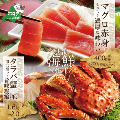 【ふるさと納税】マグロ ・ かに 海鮮セット マグロ赤身 400g前後(200g前後2パック) + 数量限定の新物!活き抜群タラバガニ浜ゆで急速冷凍旨味凝縮(1.6kg~ 2kg ) 1尾 【 ふるさと納税 まぐろ まぐろたたき まぐろ 赤身 柵 訳あり 鮪 生 トロ 刺身 刺身用 魚介 海鮮 魚 】