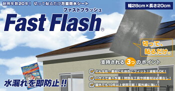 株式会社タイセイの万能防水シート 内容: ファストフラッシュ 1枚 ファストフラッシュ規格: 幅=28cm 厚み=2.3mm 長さ=20cm カラー: グレー/ブラック 特徴: ・設計耐用年数20年のEPDMゴムを表面に採用しているので、屋外使用OK! ・ブチルゴムを採用し、強力な粘着力を実現! ・簡単にできるからDIYや応急処置にも最適! ・伸長するので波板や凹凸部分にもフィット! 用途: ・ALC、RC等のコンクリートやサイディングの外壁と屋根の取り合い部分からの雨漏りに ・瓦やスレート、コロニアル等の屋根材の割れやクラック、ひび割れに ・ガルバリウム鋼板やトタン等の板金屋根、折板屋根等の金属屋根材のピンホールや腐食に ・カーポートのポリカーボネートや雨よけ、雨樋の修理や補修に ・トップライト(天窓)やサッシ廻りの防水に ・防水テープやコーキング、シーリングの代わりに ・排水管や下水道管等の圧力のかからないパイプからの水漏れ、漏水に ・陸屋根や屋上、ベランダやバルコニーの防水シートやルーフィング、塗膜防水、塗装からの雨漏りに ・その他色々! フラッシュプライマーラインナップ フラッシュプライマー フラッシュシールラインナップ フラッシュシール ファストフラッシュラインナップ 56cm×5m 28cm×5m 28cm×2.5m 28cm×1m 28cm×20cm 14cm×5m 14cm×1m ファストフラッシュ剥離剤セットラインナップ 28cm×5m 28cm×1m 14cm×5m 14cm×1m 剥離剤ラインナップ 375ml×2本 375ml×1本 60ml×1本 長さ5m 長さ2.5m 長さ1m 長さ20cm 幅56cm 単品 幅28cm 単品 剥離剤セット 単品 単品 剥離剤セット 単品 幅14cm 単品 剥離剤セット 単品 剥離剤セット